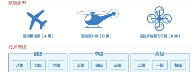 根据中国航空运动协会发布的《遥控航空模型飞行员技术等级标准》从八级、七级、六级、五级、四级、三级、二级、一级、特级,共九等,八级最低,特级最高。考试分为理论和实操两部分,理论考试达到相应级别满分80%以上的申请人,方准许进行现场飞行考核。现场飞行考核中,申请人必须独立完成飞行考核的规定动作。考核为4-8分钟(以上均包括起飞和着陆)。现场飞行考核两轮,一轮达标即通过考核。